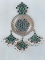 Round oxidised silver pendant with green stone work and pearl danglings, perfect for a traditional look.