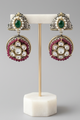 These elegant earrings feature a floral design with white kundan stones in the center, bordered with deep red beads. The top part has a green stone surrounded by tiny pearls and antique gold detailing