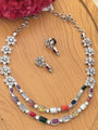 This is a beautiful 925 silver necklace featuring the Navratna stones set in a double-layer style. The upper layer has sparkling floral motifs, while the lower layer is lined with colorful gemstones.